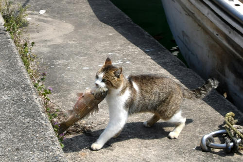 野良ちゃんが、生魚をくわえ